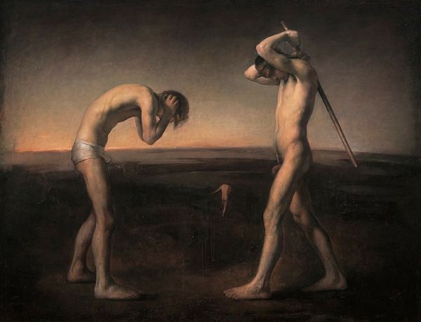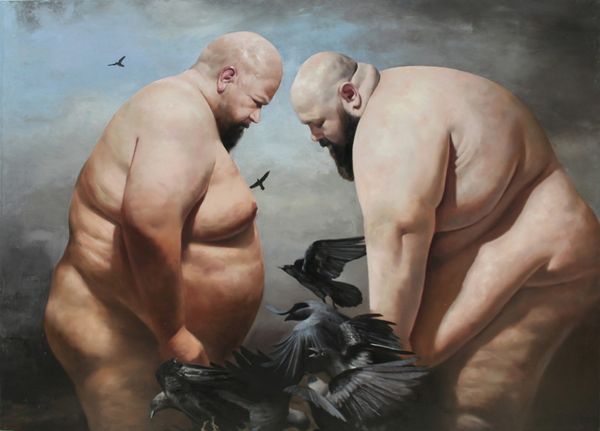 Siegfried Zademack painted this work, Charon, using oil paint on canvas. The traditional technique lends a classical feel to the subject, yet the scene is undeniably strange. Here, a nude male figure is navigating a landscape not of earth and water, but of cast-iron weights. He steps carefully from one to the next, his balance maintained by a long pole, also made of wood, perhaps even a broom. More weights orbit him in the air, as though he is somehow generating them, or they are the detritus of some unknown labor. The work is fascinating for the dialogue it creates between the figure – classically rendered, but posed with his back to us – and the industrial objects that surround him. These have an incredible presence, due to the artist’s attention to their texture, weight, and form. Ultimately, Zademack compels us to consider not only the content of the painting, but also how the material of the oil paint and cast iron weights shapes its meaning.