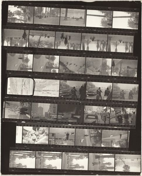 Editor: This gelatin silver print, titled "Paris 17A", was created by Robert Frank between 1949 and 1950. What strikes me most is its raw, documentary feel. It's like a series of glimpses into Parisian life, captured on a single contact sheet. What do you make of it? Curator: It’s important to see this in the context of post-war Europe. Frank, though Swiss, documented a rapidly changing world. The contact sheet itself— the uncut roll of film—suggests immediacy and lack of editing, a conscious decision to present a ‘truthful’ image of Parisian society. Editor: Truthful in what sense? I notice the presence of nuns, possibly brides, and other diverse figures. It's quite a mix! Curator: Exactly. It speaks to the layers within Parisian society, its religious institutions, celebratory rituals, and everyday scenes like parks. Frank seems interested in exploring the juxtapositions and the varied social classes present in a city still recovering from the war, while simultaneously presenting an image to the future. Editor: So it’s a historical document as well as an art piece. Curator: Absolutely! The raw, unedited format is, I think, a comment on the act of image-making itself. How do institutions, including Frank's own practice, create the “story” of Paris? It seems this question is the focus rather than pretty photographs. Editor: It challenges this concept by revealing the frames around it, the outtakes almost? Very interesting, I never thought of that, but it is very informative for the time this was produced. Curator: Yes! Frank wants us to be critical viewers, understanding the forces at play behind what we see and consume. This contact sheet encourages active participation by urging us to think through those elements on our own. Editor: This artwork taught me so much more about how to analyze street photography, thinking critically. Curator: And for me, it reinforces the enduring power of art to raise important social and historical questions.