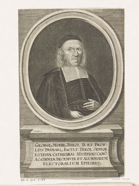Johann Christoph Boecklin created this print of Georg Moebius in the late 17th century. The portrait, made with etching, presents us with more than just an image; it offers a glimpse into the world of academia and theology in the Holy Roman Empire. Moebius, a theologian, is framed by inscriptions detailing his titles and affiliations, key to understanding the power structures of the time. The Latin text and formal attire speak to the importance of classical education and religious authority in shaping intellectual life. Boecklin, through his technical skill, not only captures Moebius’ likeness but also the essence of his social standing. Was this image designed to celebrate Moebius and to reinforce these social structures, or was it an attempt to elevate the status of the artist? To delve deeper, we could consult archival records to uncover the relationship between artist and sitter. Examining the history of the University of Leipzig could shed light on the significance of Moebius' role within that institution. What can this image tell us about the public role of intellectuals during the period?