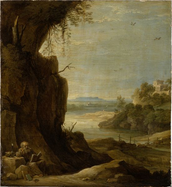 Editor: This is "The Sunset," an oil painting created around 1510 by Giorgione. The atmosphere is quite somber; I’m getting a pensive vibe from this landscape and the figures within it. What captures your attention most in this piece? Curator: That's a good read. What I see is a world teetering between drama and stillness, wouldn't you agree? Those looming rock formations… they almost have faces, don't they? And then, these tiny figures – what stories are they whispering into the twilight? I love how Giorgione uses light here. It's not just about illumination; it's like a character in itself, adding another layer of emotion to the whole scene. It pulls you in, asking more than it tells. Don’t you find it kind of strange how serene yet troubled it feels? Editor: I hadn't thought of the rocks having faces! It makes the painting feel more alive, like the landscape itself is watching the scene unfold. Curator: Exactly! It’s as if the Renaissance has suddenly grown a bit introspective. It's as though it's aware of its beauty but also deeply conscious of the fleeting nature of time and existence. Makes you think, right? This isn’t your typical hero-worship. It's humanity framed by something ancient, immutable, and honestly… a little indifferent. Editor: Definitely something to think about. Thanks, this has opened my eyes to many things! I may go write a poem or something now! Curator: Good. Then Giorgione’s magic worked its spell on you too. Now, off you pop; go and chase the sunset within!