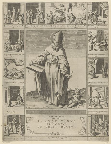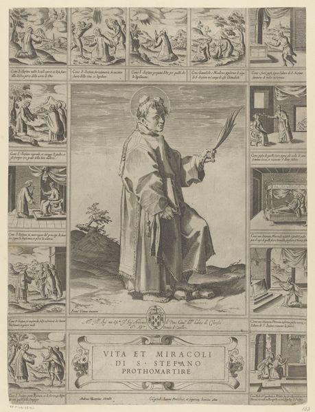 Editor: This engraving from 1604, "Life of Saint Francis of Assisi," presents the saint encircled by scenes from his life. The composition feels almost like a comic strip telling a story. What do you make of it? Curator: What immediately strikes me is the almost Byzantine quality despite its Baroque styling. It is almost like a triptych condensed into one panel, calling to mind stained glass windows with depictions of biblical events. Look at Francis: he’s the anchor, centrally placed, emanating a specific serenity, his open hand a visual invitation. Do you sense that tension between movement and stillness? Editor: Definitely, the scenes are active, while he is much calmer. Why this juxtaposition? Curator: Each scene represents an episode or a symbol in his life. For example, to the right is the scene in which he receives stigmata. Look at Francis again. He bears a cross but is haloed; it mirrors the glory of heaven, which visually links earthly suffering to redemption and divine grace. It is a potent spiritual statement, all coded in familiar visual iconography. Editor: It is interesting how consistent some of the symbols are throughout time. Curator: Indeed. It's a visual language, continuously evolving, yet echoing its past. Understanding this lets us decode stories of faith, power, and humanity itself. I’d suggest the question isn't only, "What does it mean?" but "What did it mean, then? What does it mean, now?" Editor: Thank you. It is amazing to see how those symbols evolve and transform across cultures. Curator: Precisely, the engraving speaks to our cultural memory, linking our past to the present through resonant imagery.