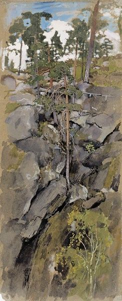 Editor: Here we have Hans Heysen's "The Quarry" from 1922, an oil painting that captures an Australian landscape being worked. I’m struck by the contrast between the raw, natural environment and the intrusion of industrial activity. What socio-historical elements jump out at you when you look at it? Curator: Immediately, I see a commentary on the changing Australian identity in the early 20th century. The painting documents the transformation of the landscape through industry, a narrative interwoven with nation-building and resource exploitation. This was post-Federation Australia, carving out its identity. What kind of visual strategies does Heysen employ to portray this narrative? Editor: Well, there’s this strong vertical composition emphasizing the scale of the quarry, which feels almost overwhelming. The figures look quite small against it. The limited colour palette adds to the feeling of environmental constraint, doesn’t it? Curator: Precisely! The muted tones speak to the visual reality of the landscape, but also arguably a societal acceptance, or even glorification, of resource extraction. He's not necessarily critiquing it outright, which raises a key point: Who was this artwork intended for, and how did its patronage influence its message? Do we see similar landscape approaches in work produced by Heysen around the same time? Editor: I'm guessing wealthy landowners or industrialists might have been the primary patrons... other pieces I've seen depict serene farmlands, definitely romanticizing rural life. So this painting kind of slots into this public art image building an industrial and hard-working nation? Curator: Exactly. This artwork is then not simply a depiction of a quarry, but evidence of the cultural values and socio-political landscape of the era. Heysen gives visual form to nation-building in that moment in time. Editor: I see it now. This isn't just landscape, it's historical commentary. Thanks! Curator: Indeed. Looking at art with an eye to social and institutional forces really deepens our understanding of both the work itself and the world it comes from.