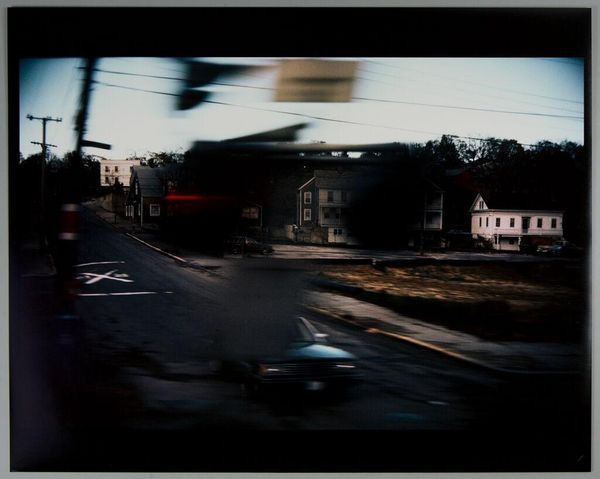 Editor: Rodger Kingston's photograph, "School Street Barber Shop, Belmont, MA," captures a quintessential small-town scene. There's a real sense of nostalgia in the light and the composition. What stands out to you? Curator: Consider the visual language here: the barber shop pole echoed by the vertical "DRUGS" sign, the orange car mirroring the traffic light. What do these repetitions suggest to you about the rhythms of daily life in Belmont? Editor: It's like Kingston is pointing out the familiar, almost ritualistic, elements of this place. Curator: Precisely. The image becomes a symbol, a cultural artifact representing small-town America and its enduring appeal. Did you notice how the traffic light is glowing green? Editor: Good eye! I hadn't noticed that. Curator: So, there you have it, a symbol of hope or perhaps continuity. I have learned a lot here, and hope you did too. Editor: I did! Thanks for pointing out those details.