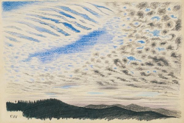 Karl Wiener made this "Nature Study" sometime between 1901 and 1949, we don’t know exactly when or with what but it looks like coloured pencils. Notice the way the strokes of the pencil build up into areas of colour; it’s like he’s constructing the world bit by bit. The sky has this rough texture, and the clouds are soft and smudgy, like a memory. The land looks like a jagged line of dark, mysterious hills. It's interesting how Wiener captures something so expansive with something so simple. I am thinking about the way the sky is almost vibrating with colour - like he’s trying to capture the light, the movement, the feeling of being in nature. There’s something very immediate about the work, something that makes you feel like you’re standing right there with him, looking at that sky. It reminds me of Agnes Martin’s subtle colour gradations, the way she could make a whole world out of just a few lines.
