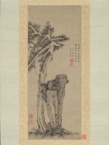 Editor: We're looking at "Snowy Landscape," a serene drawing in ink on paper from 1824 by Takahashi Sōhei, currently residing at the Metropolitan Museum of Art. It's...gentle, isn't it? Almost whispering. I am curious about the use of space; it feels very deliberate. What strikes you when you look at this piece? Curator: Ah, a whisper indeed! It reminds me of quiet mornings after a snowfall, when everything feels muted and contemplative. I am fond of the artist’s economy of line, you see. It’s almost haiku-like. How, with a few brushstrokes, they capture the essence of the winter landscape and suggest an immensity beyond the silk or paper they painted on? Editor: A haiku—that's a great comparison. It is interesting how the starkness of the black ink against the white paper emphasizes the isolation of the scene. Does this evoke a specific cultural context for you? Curator: Absolutely! You know, traditional Asian landscape painting isn’t just about depicting a scene; it’s about conveying a feeling, a philosophy, and relationship between humanity and nature. See how small and insignificant we are made to feel in comparison? As if one is a temporary wanderer, a passing observer. This is perhaps related to elements of Taoism and Zen Buddhism influencing the artwork, wouldn’t you agree? Editor: That is true. Now that I see the work from that angle, I notice the arrangement creates this beautiful, melancholic sensation. I would have missed all of this otherwise. Thank you! Curator: You see, this is where art and its secrets are truly beautiful. Once you think about it and then dive deep within, an amazing world can be uncovered. It has been a true joy examining this art with you!