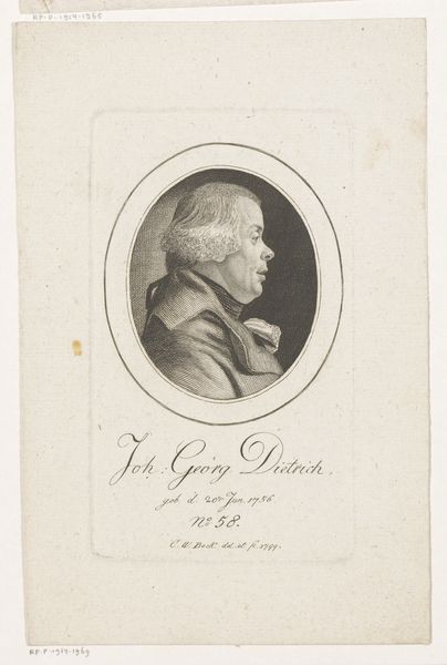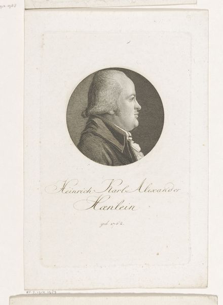 Christoph-Wilhelm Bock created this portrait of Johann Christoph Friedrich Schmidt with etching and engraving. The circular frame and delicate lines give this portrait a classical, almost timeless quality. Note how the artist plays with light and shadow to define Schmidt's profile. The engraver uses hatching lines in varied densities to model the face, creating an illusion of depth and volume. Consider how such portraits functioned within the social and intellectual context of the time. They served not just as likenesses but also as symbols of status and intellect. The clean lines and structured composition reflect Enlightenment ideals of order and reason. The stark contrast between the figure and background removes any distraction, focusing the viewer's attention on the individual. Observe that the engraver's meticulous technique turns a simple portrait into a sophisticated representation that conveys the subject’s character and social standing. The carefully crafted details prompt us to reflect on how identity is constructed through art.