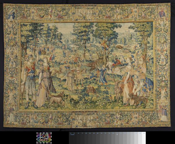 Curator: Landschapsverdure met leeuwen en jachtscènes—roughly translated, a landscape tapestry with lions and hunting scenes—dates from around 1650 and is attributed to Erasmus Oorlofs. It's a fascinating mixed-media piece. Editor: It certainly is! At first glance, it strikes me as both chaotic and incredibly detailed. All that activity in the forest. The use of textile in the figures makes it somewhat whimsical and alive, like it is still living somehow. What strikes you most about it? Curator: You've touched upon its dual nature, chaos and detail. Think of Baroque drama played out on threads. For me, it's the story it whispers. See how the lions command the center, a powerful image in the domestic sphere, like bringing the hunt indoors. A bit aggressive, no? Makes me wonder about the commissioner's status. A real power move! What do you imagine hung beside it? Editor: Perhaps more scenes like this one, each showcasing different displays of nature and humanity’s command over it. And how do you feel the tapestry medium itself contributes to the artwork’s impact? Curator: The medium is magnificent, isn’t it? The very act of weaving elevates the everyday—hunting, landscapes—to high art, meant to impress. In weaving the pastoral and the violent together, is there an acknowledgement of the violence needed for pastoral bliss? Just me pondering aloud, really. How would you describe its relationship to contemporary media? Editor: Thinking about that…perhaps it shares a kinship with digitally created landscapes in video games, these hyper-realistic, intricate environments where the player can enact power fantasies, and yet, you can literally touch this. It's weird to think that they mirror one another across such huge gaps of technology. Curator: Wonderful parallel! Exactly. These are woven worlds. I've found fresh threads here; thanks! Editor: My pleasure; the insights were really illuminating!