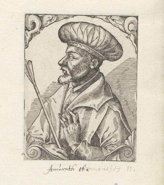 Curator: I'm struck immediately by the weight of the man's gaze, or rather, the fact that his gaze is averted. It imparts a sense of interiority, perhaps melancholy, right? Editor: Indeed. The artist here has presented us with what we believe to be a portrait of Christophe de Longueil. This engraving, dating sometime between 1549 and 1577, offers an intriguing glimpse into Renaissance portraiture. Curator: And note how contained he is! The decorative frame surrounding the subject—is that foliage?—almost seems to restrain his presence, reinforcing that inward focus. What does the frame evoke in you? Editor: I see a very deliberate act of commemoration and idealization at play. Framing a figure like this immediately elevates his status. Look at the architectural elements combined with natural motifs, a symbolic gesture towards enduring legacy. We have a kind of Renaissance architecture enclosing a fleeting moment of human experience. Curator: Yes, and this is further amplified by the geometric lines of his clothing sharply juxtaposed with the curving designs of the frame, providing us a subtle visual cue, speaking to a deeper cultural order. Note also the book he holds. I find its presence especially compelling, implying his access to the sacred, his potential for self reflection through scholarship. It lends itself to a certain mystique that resonates through history. Editor: It does indeed. The very act of reading and learning was imbued with significant cultural power during the Renaissance. And that leads me to wonder, what narratives and social forces propelled such portraits into existence, ensuring that particular likenesses of certain figures—mainly elite males, of course— were preserved for posterity. These types of portraits weren’t only depictions, they also dictated access to visibility. Curator: So you feel these symbolic elements like the frame and book helped ensure Longueil’s social endurance? They served to actively construct memory and bolster an elite image of the time? Editor: Precisely. Images can operate as active political instruments, participating in power relations, long after the subject themselves has disappeared. What is history if not iconography, arranged and memorialized? Curator: Well, it seems to me that art of this caliber leaves a layered tapestry. It enables us to examine those forces, acknowledge cultural imprints, and more fully come to terms with how we actively imbue images with symbolism over time. Editor: I agree. By questioning visual histories we unlock conversations and reclaim diverse, multiple interpretations.