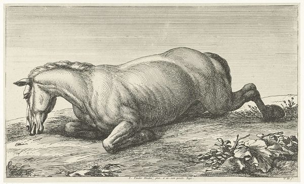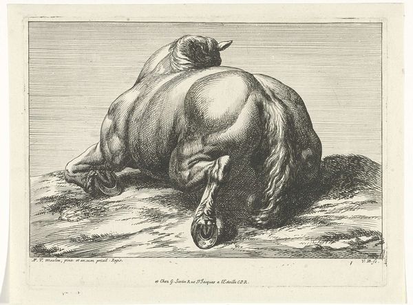 Editor: So, this is “Fallen Horse Lying on Its Left Side,” an engraving made sometime between 1674 and 1733 by Jan van Huchtenburg. It's quite striking, almost grotesque, how the horse is contorted. What strikes you when you look at this piece? Curator: What immediately stands out is the depiction of violence, specifically in the context of 17th and 18th-century warfare. The engraving captures a casualty of battle, an animal whose body bears witness to human conflict. Huchtenburg was known for battle scenes, so how does the isolated depiction of this fallen horse challenge romanticized notions of war? Editor: That’s a perspective I hadn't considered. I was focusing more on the artistic skill in rendering the horse’s form. Curator: Exactly, there’s skill, but to what end? By stripping away the heroic narrative often associated with battle scenes, and instead focusing on the suffering of a single creature, is Huchtenburg making a statement about the true cost of war? Does it prompt a sense of empathy, a challenge to the detached, masculine gaze often applied to depictions of conflict? Editor: I see what you mean. It makes me think about the countless animals exploited in human conflicts throughout history. Was this a common theme in art from this period? Curator: While not always explicit, anxieties around violence and power were certainly present. Images like these can be seen as subtle critiques, prompting viewers to question the accepted norms and narratives surrounding warfare and societal power structures. Think about whose stories get told, and whose are conveniently left out. Editor: That’s a really powerful way to look at it. I guess I was too focused on the surface-level representation. Now, I can see the artist pointing at the political and ethical considerations through this portrayal. Thanks! Curator: Absolutely. It is through considering the political implications behind a simple image like this, and examining the artist's motivations and broader cultural context that we see the historical narrative this work reflects.