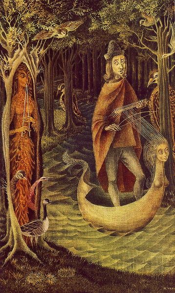 Editor: This is “Character,” an oil painting by Remedios Varo, possibly undated. The figure feels unsettling, almost like a faun escaping a nightmare, but the colors are soothing. What do you see in this piece? Curator: I see a potent interrogation of hybridity and societal expectations. Varo, a Surrealist who fled to Mexico, often used such figures to explore themes of exile and transformation. What does it mean to be human, animal, other? Notice the delicate wings juxtaposed against the rough, almost reptilian skin. How does this internal conflict resonate with broader societal tensions? Editor: The wings seem too fragile for the body, as if they were forced onto the figure. I guess that maybe the hybridity could relate to displacement from her home? Curator: Precisely! Varo’s personal experiences certainly seep into her art. This forced integration, the clash between inherent nature and imposed roles, can be read as a commentary on the immigrant experience. Does the creature appear to be in harmony with the natural setting? Editor: No, it feels very separate. Like it’s fleeing into a world it doesn't belong to. Curator: The painting becomes a powerful allegory for the challenges faced by those who exist outside societal norms, those who carry the weight of otherness. The creature, an exile in its own right, questions the very notion of belonging. Editor: I never thought about exile being more than geographical. It makes me rethink belonging. Curator: Exactly! Art is a mirror reflecting our own complex relationship with the world. Seeing this work through an intersectional lens, examining identity, migration, and societal power structures, illuminates these complexities further.