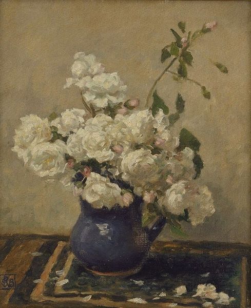 Curator: This is Corneliu Baba’s “White Peonies in Green Vase,” created in 1937. It's an oil painting, and it's a fantastic example of Baba’s still-life work. Editor: There’s something immediately comforting about it. The muted tones, the overflowing flowers. It feels like a scene from a beloved, if slightly faded, memory. Curator: Baba’s career began in a tumultuous time in Romanian history. Still life, like this, served many Eastern European artists during the Socialist Realism era as a space for artistic exploration outside the confines of political subject matter. Did flowers carry a kind of… silent protest, do you think? Editor: Absolutely! Flowers, particularly white ones, are deeply symbolic. Innocence, purity, but also remembrance and mourning. The fullness of the peonies in this vase seems to symbolize abundance but, perhaps also, fragility. Given the context, that fragility feels quite poignant. Curator: Notice, too, the impasto technique. The thick application of paint gives the petals texture and almost makes them look like they’re about to burst forth from the canvas. It mirrors the burgeoning artistic voices trying to break through during that era. Editor: It also draws attention to the physical act of creation. The flowers become a representation, not just of beauty, but of the artist’s own struggles and triumphs as he navigates political boundaries in representing visual forms. Curator: Considering it’s a still life, the painting has an amazing vitality. Perhaps that's because the art-historical association of flowers, as a silent language of their time, gave strength and visual energy to artists such as Baba to pursue their own creative interpretation despite external limitations. Editor: It really prompts reflection on the power of imagery and its cultural endurance. You begin to appreciate its lasting impressions as if their influence stretches out towards eternity. Curator: This examination has opened my eyes even further. It goes to show the value of artistic integrity to express individual thoughts despite possible external pressures. Editor: Indeed. The beauty of Baba’s work lies in its subtle ability to convey meaning that transcends eras and constraints, doesn't it?