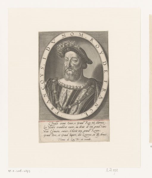 Nicolaus Mettel created this print of Frans van Mieris using etching, a technique known for its intricate lines and tonal depth. Notice how Mettel uses line and form to frame the composition, presenting van Mieris as if he is emerging from an arched window. This not only focuses our attention but also invokes a sense of classical architecture, adding a layer of formality. The background, rendered in dense hatching, contrasts with the smoother areas of van Mieris's face and clothing, creating depth and dimension. Mettel cleverly uses the materiality of the etching to mimic the textures of fabric, skin, and glass. This elevates the portrait beyond mere representation, inviting us to consider how the medium itself contributes to our understanding and appreciation of the subject. The inscription serves to solidify the subject's identity. The geometric elements of the architectural frame, in contrast with the organic curves of the figure, suggest a dialogue between the individual and the structures that define his world. This print remains open for ongoing readings and insights.