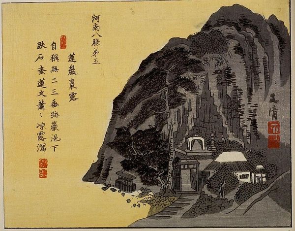 Curator: This is "Bridge in the Clouds" by Katsushika Hokusai. It's a woodblock print, placing it within the Ukiyo-e tradition. Editor: Wow, it feels so… isolated, and almost dreamlike. The bridge stretching between those rocky peaks suspended above the clouds— it sparks my imagination. Curator: Indeed. Let's consider the physical process here. Creating a woodblock print requires careful carving of the image onto a wood block, a labor-intensive activity passed on through generations. We can see evidence of careful planning of color blocks used to create texture in the landscape. Editor: Thinking about those processes, the time invested... it shifts my perception. It makes me think about how much physical labor translates into creating ethereal beauty. It’s funny, seeing this serene, almost heavenly place, created with such earthly effort. Curator: Absolutely. It challenges the traditional view of "high art," really. We can think of "ukiyo-e," meaning "pictures of the floating world," as a highly commodified art form distributed to wide audiences that blurs the line between commercial enterprise and fine art. Editor: And even now, staring at it, it floats... it draws my eye from craggy precipices up to those quaint structures. A temple seemingly held together with glue or willpower sits at the center. Who makes it all the way up there? Curator: Well, religious architecture often evokes that desire to reach an elevated plane—both physical and spiritual. You mentioned those buildings earlier. Thinking in material terms, they represent a considerable investment in labor and resources to establish a presence high among the clouds. Editor: Yes, it reminds me of stories and myths where gods live above the clouds, separated by some unspannable distance from humanity... Here it is spanned! How incredible that even the sacred spaces, like here, were touched by all these hands. Curator: Examining those intersections – between labor, materials, spiritual and artistic intention -- is really where these works become interesting. Editor: I agree. Seeing the meeting point of imagination and practical action just gives the art, for me, even more meaning.