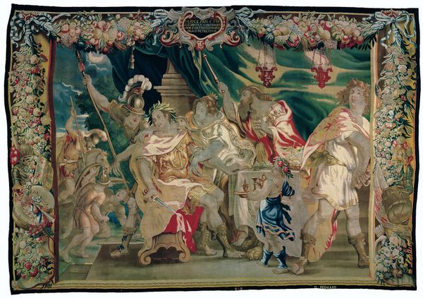 Curator: Domenico Paradisi created this tapestry between 1684 and 1739. It’s titled "The Crusaders Reach Jerusalem," and it’s part of a series of scenes from Gerusalemme Liberata. Editor: Whoa, that’s quite the heroic entrance! Talk about making a statement—it’s like, "We’re here, and we've got horses!" The colors feel both grand and a little faded, like a story being told through generations. Curator: Exactly. Tapestries of this era often served that purpose – storytelling writ large. The figures are, as you note, arranged for maximum dramatic effect. Notice the densely packed Crusaders, spears held high, juxtaposed with the somewhat subdued depiction of Jerusalem in the background. Editor: It's interesting, isn't it? The holy city almost seems secondary, a backdrop to the display of military might. Are we meant to focus on the triumph of the Crusaders, or question the cost of that triumph? Look at those almost caricatured faces…they look like Roman emperors, very conscious of appearances! Curator: The symbols definitely lean heavily into power. Horses always equal strength and authority. The flags, the armor…Paradisi is invoking a very specific visual language of dominance and, you're right, he seems conscious of past images. You’ve got echoes of Roman Triumphs there and the biblical "triumphant entry into Jerusalem" stories – like the past legitimizing the present. Editor: That totally rings true. It is interesting to contemplate what symbols resonate and which ones seem stuck in old memory...But, as a viewer, I find it hard to ignore the fact that it’s woven! The tactile quality, all those interwoven threads—it adds this layer of warmth, making the historical drama strangely…approachable? Or at least making me think about how long this work took to make and why! Curator: Indeed. The material itself tells a story. This wasn't mass-produced; it was painstakingly crafted. Each thread contributes to the larger narrative, like individual acts of devotion culminating in a grand crusade. This is a celebration but there's also deep devotion here. Editor: Well, devotion makes people do crazy things, good and bad...So, here’s a bit of that human paradox beautifully woven into threads and colors and war! Curator: Absolutely! The weight of history and devotion – a fitting perspective to carry with us.