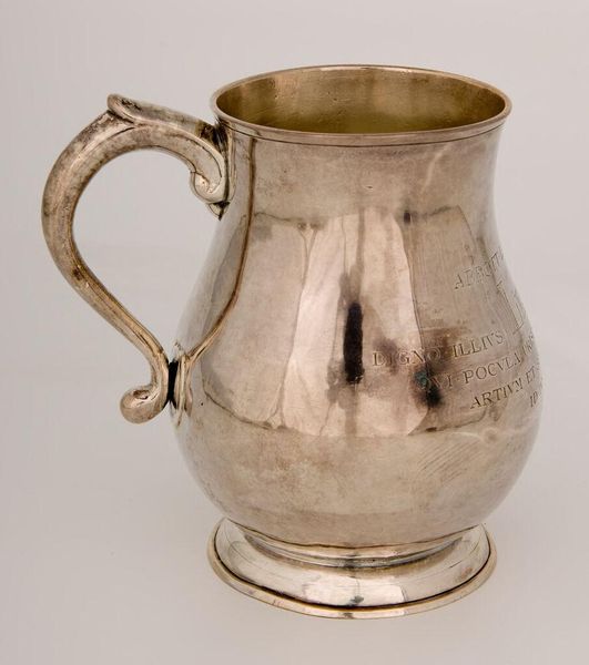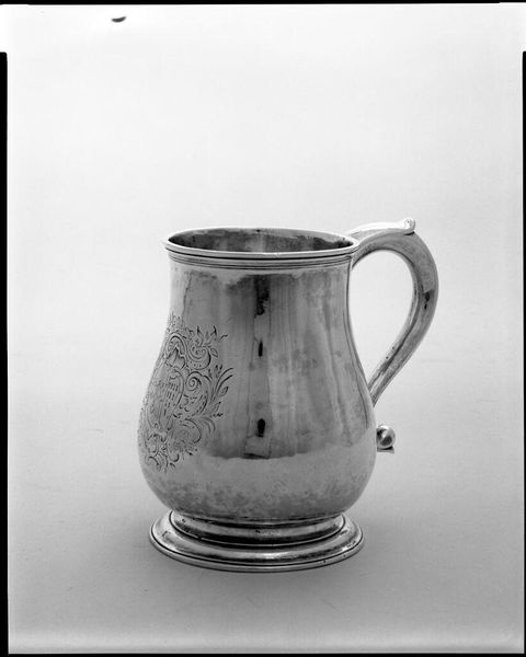 Editor: Here we have a silver cann by Paul Revere, currently residing at the Harvard Art Museums. It feels quite austere, yet that handle has a touch of baroque flair. What symbolic weight might this object have carried in its time? Curator: The cann, though functional, transcends mere utility. Its silver surface, reflecting light, hints at prosperity and status. Consider the engraved initials; they speak to lineage, of family legacy being poured from this very vessel. Editor: It’s interesting how something so simple can represent so much. Curator: Indeed. What stories do you imagine were shared over drinks from this cann? What memories were forged? Editor: Now I’m picturing it in candlelight, part of some lively gathering, a symbol of shared experience. Curator: Precisely! It becomes a vessel not just for liquid, but for cultural memory itself. Editor: Thanks, I never would have considered the cann as a symbol of memory.