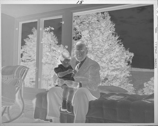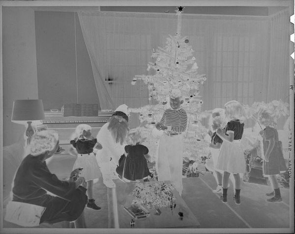 Curator: This is an untitled photograph by Lucian and Mary Brown, found at the Harvard Art Museums, depicting a grandfather with two children. Editor: The high contrast immediately gives it an unsettling, almost ghostly feeling. The subjects appear caught between presence and absence. Curator: Note how the composition is structured around the central figure, the grandfather, whose form is softened by the bright light, flanked by the starker, more defined children. Editor: I see a poignant representation of intergenerational relationships, particularly as it relates to the passage of time, where innocence is juxtaposed against experience. The inverted tonal scale gives a sense of historical weight and memory. Curator: Precisely. The strategic manipulation of light and shadow directs the eye, creating a balanced, yet enigmatic composition. Editor: Ultimately, the image asks us to consider our relationships to the past, and how we interpret images that feel both familiar and alienating.