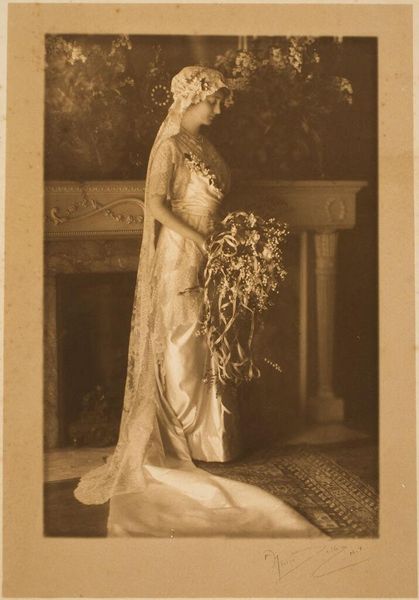Curator: This photograph, simply titled "Untitled (bridal portrait)" comes to us from the artist Martin Schweig and resides here at the Harvard Art Museums. The dimensions of the image itself are roughly 9 by 6 inches. Editor: It has a beautiful, ethereal quality, doesn't it? The sepia tone lends a dreamlike atmosphere to the whole scene. Curator: Absolutely. The bride's attire speaks volumes about the social expectations placed on women during the era in which this was likely taken. Her dress, the veil... symbols of purity and new beginnings. Editor: And the flowers she holds – likely chosen not just for their beauty, but for what they represent: fertility, love, hope for the future. They are a powerful, if subtle, visual language. Curator: Indeed. Photographic portraits of brides became increasingly common as photography became accessible to the middle class, solidifying the wedding portrait as a status symbol and a marker of social respectability. Editor: Thinking about this image, there's a quiet dignity there, but also a certain vulnerability as she stands on the threshold of this major life change. Curator: It's fascinating to consider how the photograph, as a medium, both reflected and shaped societal norms around marriage. Editor: It truly invites us to look beyond the surface and consider the complexities of that time, and the woman at its center.