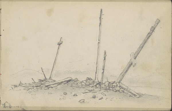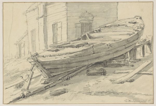 Curator: "Schip Cuba Packet gezien vanaf de wal," or "The Cuba Packet Ship Seen from the Shore," is the title of this intriguing pencil drawing, likely dating to 1857, by Willem Anthonie van Deventer. Editor: It’s… quiet. Very gray. There’s a wistful, almost haunting quality in its stark simplicity. You feel a world on the cusp of enormous change being observed, rendered almost ghostly. Curator: You pick up on something very interesting. Consider the "Cuba Packet" itself—not just a vessel, but a tangible link connecting Europe to the complex socio-political tapestry of the Americas during a time of intense colonial activity and, of course, the horrors of the transatlantic slave trade. Editor: So this isn’t just a tranquil seascape. It’s a portrait of global power dynamics, veiled beneath delicate pencil strokes. The ship, viewed from the shore, almost feels like a barrier, the rough wood contrasting against the smooth hull. It subtly whispers of distance and disconnect, even as people occupy both realms. Curator: Precisely. Van Deventer positions us, the viewers, firmly on the side of the "shore"— the observers, rather than the participants. What I find interesting is the raw quality of the sketch. It wasn’t meant to be beautiful. It's social commentary, almost in confidence. Editor: The choice of pencil lends to that intimacy. It's immediacy over perfect representation. Van Deventer caught a moment, as if it were a secret. I keep thinking of the passengers aboard, their lives moving irrevocably toward what could be great promise or great danger—a ship as portal. Curator: Yes, I think this little sketch manages to compress immense ideas of transport, both of people and ideas, with tremendous efficiency. Its roughness isn't carelessness. It reflects, instead, something fundamental about change and witnessing it. Editor: For all of its starkness, it gives a sense of almost unbearable vulnerability. It shows the strange power that even the most basic sketches possess: holding moments—and meanings—for longer than they might naturally last.