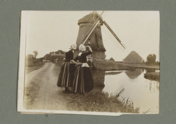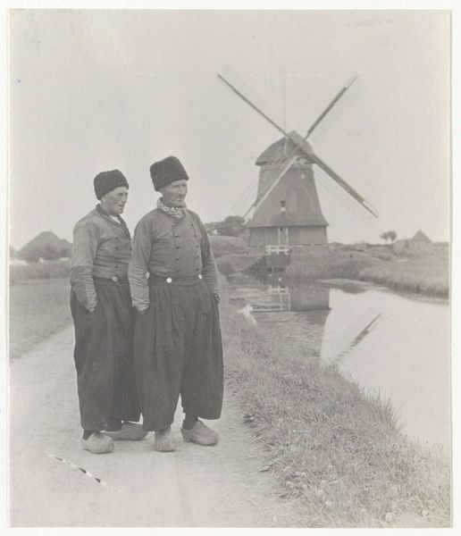 Editor: Here we have a gelatin silver print dating from around 1900-1910, titled "Two Men in Volendam Costume Standing by a Ditch with a Windmill in the Background." It's a pretty classic Dutch scene, wouldn’t you say? Very serene…almost staged, in a way. What stands out to you about this piece? Curator: It's fascinating how photographs like this participated in constructing and reinforcing national identity. The carefully chosen 'traditional' costumes and the quintessential Dutch landscape – the windmill, the flat land – project a very specific image. Do you think it represents authentic rural life or a romanticized ideal meant for consumption? Editor: Hmm, that’s a great question. I mean, it feels very… deliberate. Like a postcard. Maybe it's both? What was the purpose of such images at the turn of the century? Curator: Photographs like these became incredibly popular, fueling tourism and solidifying a visual vocabulary of "Dutchness." Think about it: these images circulated widely, creating a shared visual understanding, both domestically and internationally. But it also risks essentializing a complex culture into simple, easily digestible images. Is that limiting, do you think? Editor: I see what you mean. It's like freezing a culture in a specific time and place. Does it bother you, as a historian? Curator: As a historian, it compels me to unpack the layers of meaning. These aren't simply neutral depictions, they're carefully crafted narratives with socio-political implications. Examining them critically helps us understand how national identity is constructed and perpetuated. Think about how social media continues this trend today… Editor: That makes so much sense! I hadn’t considered the photograph as a cultural tool shaping perceptions like that. Curator: Indeed. So next time, let’s dig into this photographic strategy in our contemporary landscape. Editor: I am now excited about landscape! Thanks for this insight.