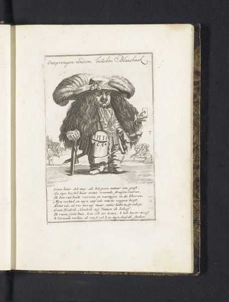 Curator: Here we have an engraving dating from between 1718 and 1720, "De dwerg Gewaande Pelgrim als pelgrim uit Compostella, 1720" or "The dwarf Self-proclaimed Pilgrim as a pilgrim from Compostella", created by Isaac Ledeboer. What strikes you first about this print? Editor: It’s immediately humorous, almost grotesque. The figure’s proportions are exaggerated, with the large head and beard dominating the composition. There’s a satirical bite to it that intrigues me. Curator: Absolutely. Ledeboer masterfully employs symbolic language. The pilgrim's garb, laden with scallop shells indicating pilgrimage to Santiago de Compostela, is rendered almost comically. Each item carries a charge; for instance, note the gourd, traditionally used for carrying water, hinting at a spiritual journey. Editor: But is this commentary aimed simply at religious devotees, or is something else at play? The figure’s small stature, described as a "dwarf" in the title, seems significant. Could the artwork be commenting on the perceived inadequacies or hypocrisies of those in positions of religious authority? Curator: Precisely. It seems to reflect a wider critique prevalent during the Baroque period, specifically the performative aspect of religious devotion. Look closer, and you'll find layers of socio-political commentary beyond the surface depiction of a pilgrim. The inscription mocks supposed hypocrisy with labels in a variety of languages to reach an international audience. Editor: This also raises the question of audience. Was this intended for public consumption, or perhaps for a more limited, educated circle capable of grasping the layered irony? The relatively small size of the print suggests intimate viewing, but the textual annotations widen its appeal. Curator: Good point. Printmaking democratized imagery during that era. Multiple impressions made art accessible beyond the elites. Prints could be readily disseminated through various channels to promote widespread, sometimes subversive social commentary. Editor: Thinking about today, it's interesting to consider how this image—originally intended to criticize the appearance of religious dedication—could speak to the idea of authenticity versus superficiality. Curator: I think the image resonates because symbols retain power, irrespective of historical context. That inherent charge creates a kind of echo chamber through collective memory. It reminds us to question assumed images and encourages more informed readings of faith, power, and personal identity. Editor: It truly demonstrates the continuing influence that a deceptively simple artwork can have on understanding social attitudes, beliefs, and power structures from centuries ago, right up to the present day.
