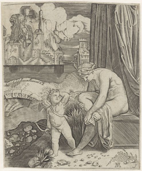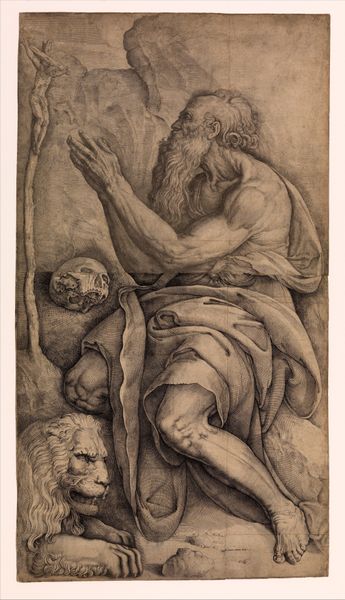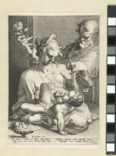 Hendrick Goltzius created this engraving, “The Holy Family,” during the late 16th-early 17th century, a time of religious upheaval and artistic innovation. Goltzius, a Dutch printmaker, was known for his virtuoso technique and his ability to capture emotion, influenced by the Mannerist style which emphasized elegance, elongated forms, and stylized features. Consider the cultural significance of depicting the Holy Family during the Reformation. For many, images like these were vital to personal faith. This was particularly important when the Catholic Church was under attack for its practices. Mary is shown kissing baby Jesus while Joseph looks on; it's an intimate scene. Through this closeness, the artwork emphasizes an emotional connection. It invites viewers to contemplate their own relationships with family. The engraving's focus on the human aspects of divinity suggests an effort to make religious figures relatable and approachable, rather than distant icons. Ultimately, the artwork reflects a need to find solace and inspiration in faith during turbulent times.