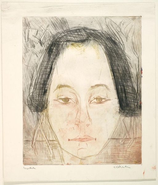 Editor: "The Girl from California" by Helene Schjerfbeck; it's quite striking! I'm immediately drawn to the contrast in the portrait--very little color. What historical narrative do you think the image tells us about its subject? Curator: The sitter’s identity as "The Girl from California" already establishes a framework of movement and cultural identity, right? I wonder how the artwork engages with the representation of women during Schjerfbeck's time, possibly pushing against conventional expectations? Editor: That’s a great point. Do you think the almost mask-like rendering of the face comments on societal expectations placed on women, this idea of performance of beauty? Curator: Absolutely, let's consider the stark minimalism— the flattened planes, reduced features. Is Schjerfbeck inviting us to see beyond superficial aesthetics, challenging the viewer to look at something deeper within this “Californian girl?” It's also important to recognize that "California" here functions as an idea, maybe a romantic one that Schjerfbeck is using in her piece? Editor: The title makes you think that it could be exoticising the subject? Almost like an “othering”? Curator: Precisely. By labeling her so, Schjerfbeck is inherently marking her as different from the viewer or from a presumed cultural norm. This draws into larger discourse on colonialism, migration, identity performance...What do you think Schjerfbeck achieves through these stylistic choices? Editor: The simplicity is deceiving; there’s so much packed in! It definitely subverts typical portraits, turning it into a question of identity rather than just representation. Curator: Exactly! I agree with this analysis. Hopefully listeners will question how portraiture always intersects with issues of gender, identity, and power.