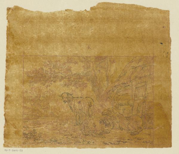 Editor: This artwork, "Blad met Adam en Eva omringd door dieren," made between 1826 and 1850 by G.N. Renner & Abel, employs watercolor and ink on paper. I’m immediately struck by its dreamlike quality; the animals floating almost suspended around the central tree. What do you make of the composition? Curator: The work presents a fascinating study in formal organization. Note how the artist distributes the figures--Adam, Eve, and the diverse bestiary—around the arboreal centerpiece. Are they grounded? Observe that the use of light and shadow serves not to create volume but to flatten the image, emphasizing surface and pattern over illusionistic depth. What is your understanding of this approach? Editor: So you're saying it's less about representing reality and more about the relationship between the elements on the page itself. It almost feels decorative, like a textile design, rather than a depiction of a scene. Curator: Precisely. Consider the framing border, echoing the internal motifs, further reinforcing this emphasis. How might you relate the color palette to this overall formal strategy? Editor: The limited colors – a pale green backdrop contrasted with gold figures – create a sense of harmony. They aren't jarring or competing with each other, which keeps the composition calm. Curator: Indeed. And that calmness is key to the impact of the work. By minimizing contrast, the artists create a unified surface, which is not only visually appealing, but draws attention to the artwork itself rather than a specific interpretation. Editor: That's fascinating; I initially saw a depiction of a narrative, but now, focusing on form, I see the conscious control and intention in creating a two-dimensional harmony. Thank you for helping me see beyond the subject matter and appreciate the artistic construction. Curator: The pleasure was all mine; seeing the narrative melt away into line and color gives one a privileged insight into its underlying beauty.