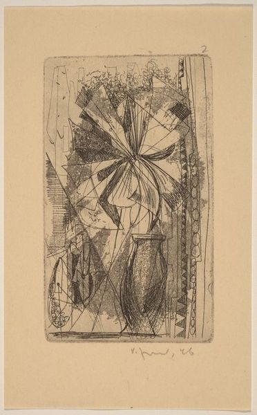 Editor: This is “Uitgebloeide Strelitzia,” or “Finished Strelitzia,” by Samuel Jessurun de Mesquita, from 1934. It’s a woodcut print at the Rijksmuseum. It feels strangely haunting, almost melancholic despite being about a flower. The stark black and white adds to that feeling. What stands out to you? Curator: Haunting is right. It whispers secrets, doesn’t it? I see a dance between life and death. The Strelitzia, past its prime, still holds a certain austere beauty. Look at those bold lines, practically gouged into the wood – a real primal energy. It reminds me of the Dutch vanitas paintings but distilled to its essence: no overflowing banquet, just the echo of beauty fading. That stylized face, almost hidden in the leaf… what do you make of her? Editor: I noticed her too. She almost blends in with the plant, like she’s part of the life cycle. Maybe it’s about the interconnectedness of everything? Curator: Interconnected, yes. Perhaps Mesquita is hinting at our own mortality reflected in the flower’s decline. The geometric shapes also fascinate me – that deliberate contrast with the organic forms. It is as if nature and structure, feeling and form, are intertwined but at odds with one another. Do you get a sense of that conflict too? Editor: I see it now, especially the strong lines boxing in the softer curves. I thought it was purely decorative, but it creates tension. Curator: Exactly! It's the struggle, the inherent drama of existence laid bare. The starkness, the raw cut of the wood...it’s not just about decay; it’s about confronting the transient nature of beauty, about the profound awareness of our shared fate. It almost brings tears to my eyes, a bittersweet ache, a song of acceptance. Does it speak to you differently now? Editor: Definitely. It’s much more than just a flower drawing; it's about us. Thanks for pointing that out!