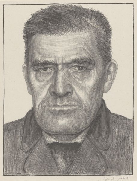Curator: Here we see Don Bachardy's portrait of Christopher Isherwood, created on August 31st, 1979. Editor: It's striking how stark and immediate the image is; there's such a directness in the gaze, almost confrontational. Curator: Absolutely. Look at the swift, confident strokes. Bachardy's process seems incredibly efficient, yet he captures so much of Isherwood's aging face. I'm curious about the paper he used; it appears quite thin, allowing the ink to bleed slightly. Editor: Notice also how Isherwood's distinctive collar creates a graphic pattern, almost like bars—does it suggest a kind of imprisonment, or limitation of the self? Curator: Perhaps, or it is a symbol of the constraints of societal expectations and the literary circles Isherwood navigated? It certainly draws attention to the neck, a vulnerable point. Editor: It's fascinating how Bachardy employs these visual cues to hint at deeper psychological themes. Curator: For me, it is the materiality of the portrait, which highlights the relationship between artist and subject. The visible labor reminds us of their shared history. Editor: A somber reflection on the writer in his later years. Curator: Yes, a very moving document of their time.