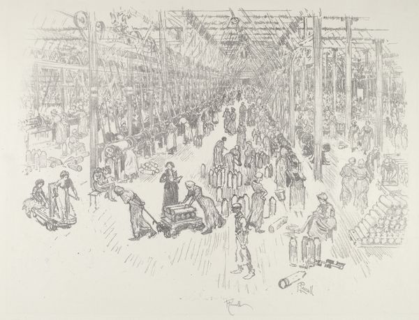 Joseph Pennell made this drawing, "Finishing Shells," with a real sense of urgency and immediacy. Look at the hatching marks, how they build up to create form, almost like he’s sketching with light and shadow. The whole scene is rendered with such raw energy. The textures! From the smooth, cold metal of the shells to the rough, industrial setting, you can almost feel the vibrations of the machinery. Pennell really captures the sheer scale and intensity of the factory floor. Notice the repetition of the shells lined up, contrasted with the figures working at their stations. There’s a rhythmic quality to it, like a visual score of labor and production. And the light! It pours in from somewhere above, illuminating the scene while also creating a sense of depth and atmosphere. Pennell reminds me a little of Charles Sheeler, who also found beauty in the industrial landscape. Both artists show us that even in the most unlikely of places, there’s always something to see, to feel, to make art about.