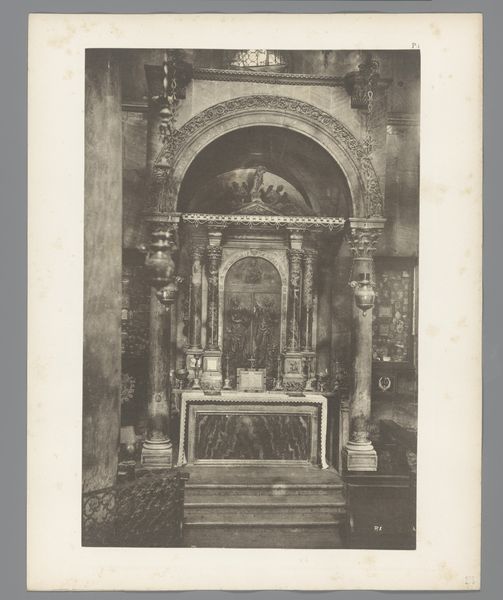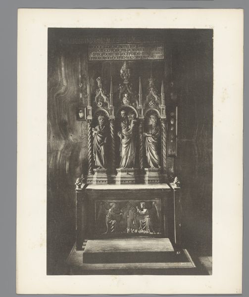 Editor: So this photogravure from between 1914 and 1918 depicts Queen Elisabeth of Belgium, but it's staged to resemble a religious icon. The setting itself looks to be the focus, almost a set or altar-like construction around the Queen. What strikes me is the mix of what appears to be the opulence of the monarchy and the simplicity of the role as a nurse. What can you tell me about this work? Curator: What immediately grabs my attention is how this image challenges the very notion of photography's supposed objectivity. Here, photography serves to reinforce class structures through careful manipulation of imagery and meaning. It speaks to a precise control over how power is presented and consumed by the public. How were such prints disseminated, and how did this availability shape the perception of Queen Elisabeth during the war? Editor: It seems to reinforce an idealised image, using classicist elements in photography, to cast the Queen in almost a divine light during a period of crisis, something far removed from conflict and destruction. Were there other ways that material processes were utilized to similar effects at the time? Curator: Absolutely. Think about war propaganda posters and mass production of art that served specific political goals. By studying the photographic processes, the labor involved, and the distribution channels for these images, we gain deeper insight into how power was consolidated and communicated during wartime. Editor: That really reframes how I see it, thinking about its impact beyond a portrait of nobility to consider production, manipulation, and wide distribution for political ends. Thank you! Curator: Exactly, considering it as an act of manufacturing consent during wartime helps decode some of its messages.