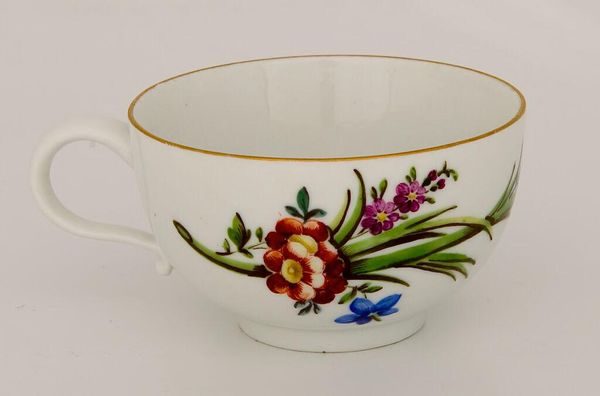 This cup and saucer were made by an anonymous artist, likely of the Staffordshire potteries, using molded earthenware with painted decoration. The material, also known as ‘creamware’ due to its pale tone, was developed in the mid-1700s. Its smooth surface results from firing at high temperatures. This allows for intricate shapes to be created through industrial processes like slip-casting. The floral patterns—vibrant pinks and blues—were added by hand. These embellishments enhanced the appeal of mass-produced items for the growing middle class. What’s really interesting is how the cup and saucer represent a fusion of industrial production and individual craftsmanship. While the ceramic form could be replicated ad infinitum, each painted piece carries subtle variations, reminding us of the human touch in its creation. Appreciating this tension allows us to move beyond traditional hierarchies of art, recognizing the artistry inherent in everyday objects.