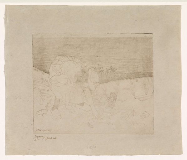 Curator: Here we have Jan Toorop's etching, "Shell Fisherman with Net on the Beach at Katwijk aan Zee," created around 1902. Editor: My first impression is how subdued the colors are. It’s almost monochromatic, with this pale palette giving it a very dreamlike, perhaps even melancholic feel. Curator: It certainly captures a sense of isolation. Toorop was known for his symbolism, and during this period, the lives of fishermen were becoming increasingly precarious due to industrialization and changing fishing practices. This print, viewed within that context, hints at larger socio-economic struggles. Editor: Right. And you see that reflected in the fisherman’s posture—he seems almost burdened, doesn’t he? Is this perhaps commenting on the changing position of the working class within the Netherlands at the time? I notice the flatness of the horizon line, a choice that focuses us on the solitary figure in the landscape. It suggests a confrontation between man and nature. Curator: Absolutely. And note how Toorop doesn't romanticize the figure; there's a rawness to the lines, depicting him more realistically. This speaks volumes about Toorop's intentions. He portrays labour without idealizing it, perhaps even showing its alienating effects. It’s as though the weight of tradition and labor bears down on this figure. The setting—Katwijk aan Zee—adds another layer of complexity, this was a town undergoing significant changes, feeling the pull between old ways of life and the modern world. Editor: This is making me think about how this piece resonates today. Considering global fisheries facing immense pressure, with many traditional fishing communities on the brink of disappearing. This image acts as a poignant commentary that feels tragically relevant now. Curator: It highlights the precariousness of labor in the face of larger societal and environmental forces. I believe what strikes me most is Toorop's ability to infuse a single figure with the weight of broader social anxieties and precarity. Editor: And for me, I’m reminded of the enduring human story of those facing overwhelming economic and ecological pressures, which the composition powerfully highlights, I'll be thinking about this one for a while.