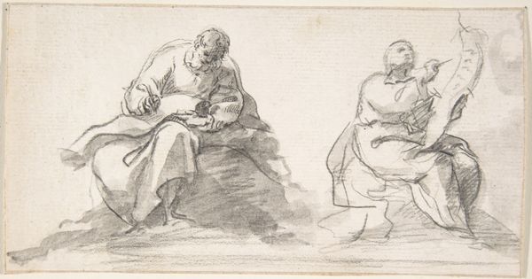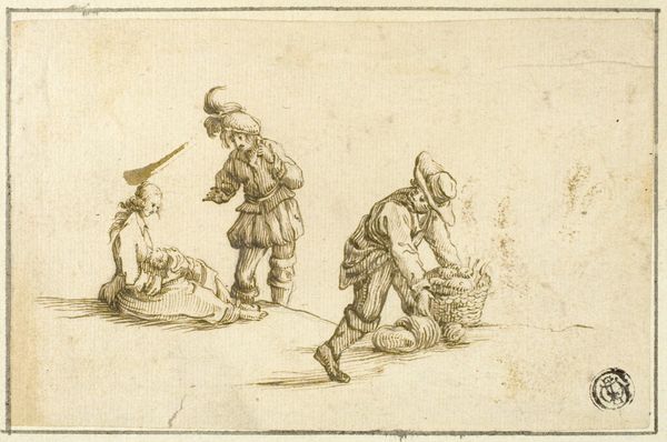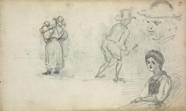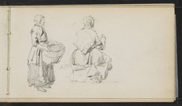 Curator: This sketch is called "Twee figuren," or "Two Figures," created by Cornelis Springer around 1860 to 1866. You can currently find it here at the Rijksmuseum. Springer worked primarily with pencil on paper for this piece. Editor: There's a certain quiet sadness to this image. The sketchiness of the figures, combined with their postures—one standing with his arm raised, perhaps signaling, and the other kneeling—gives it a vulnerable, almost forlorn air. Curator: The beauty of these quick sketches is that you can interpret them so many ways. The loose pencil work and open composition leaves room for imagination. Consider, for instance, the raised arm: is it a signal, or is he simply reaching for something? The ambiguity is deliberate, I believe. Editor: Absolutely, the sketchiness heightens the mystery. Technically speaking, note the varying degrees of detail—the standing figure more defined than the kneeling one. That selective emphasis contributes to the overall feeling of… displacement, I suppose. Curator: Displacement? I hadn't considered that, but the difference in clarity between the two figures creates a psychological distance between them. Are they connected? Are they experiencing the same thing? The composition pulls them apart despite being so close. Editor: Indeed. And think about the gaze as well. It's almost as though the figure on his knees is glancing downwards into nothing. His body position along with that lost expression produces a visual field of emotion within the sketch's physical form. It resonates! Curator: This little sketch manages to conjure quite a complex scene from just a few simple lines. I think Springer’s focus here wasn’t about rendering reality but evoking an emotion, leaving us as viewers to fill in the narrative gaps with our own interpretations. Editor: It's fascinating how much story resides within a seemingly simple piece. What begins as line and form transforms into a potent psychological portrait—less about who they are, and more about what they feel. It is just a fragment, and that makes it so captivating.
