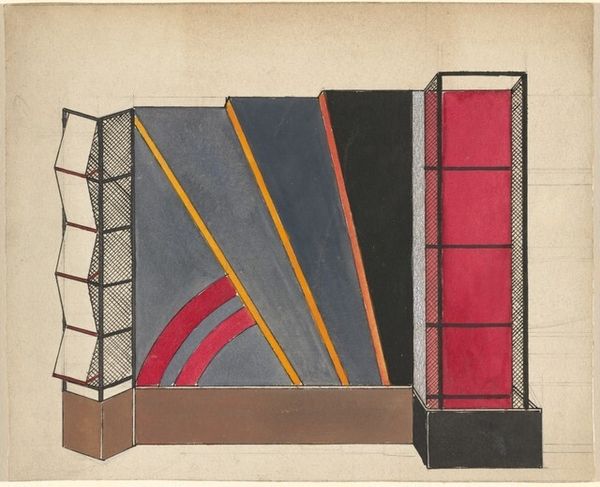 Editor: So, this is Theo van Doesburg's "Colour Solution," made sometime in the 1920s with acrylic paint. It definitely has a stark, almost unsettling vibe with those clashing blocks of color and sharp geometric shapes. What jumps out at you when you look at it? Curator: Ah, yes, Doesburg! It always feels like he’s trying to reconstruct reality from its very Lego bricks. What I love about "Colour Solution" is how it whispers – no, shouts! – of the De Stijl movement's quest for pure abstraction. See how the rigid verticals and horizontals box in the colours. Do you feel, as I do, the almost spiritual longing for harmony, ironically expressed through such calculated disarray? It’s like life…organised chaos. Editor: Definitely, I can see the order and the chaos. Is that supposed to be a room, though? Curator: Is it? Perhaps! It could be the blueprint of a mind as much as a room. The black floor anchors us, even as the colored panels seem to defy gravity, no? Maybe he's not showing us a space, but the bare bones of how we perceive space – or, more precisely, the absurd humor in even trying to truly define it. Editor: It's weird to think of abstraction having humor. Curator: Oh, darling, art without humor is just wallpaper. Doesn’t this almost feel like a stage set, devoid of actors, yet ripe with potential drama? The severe angles are saying, "something interesting could happen," whilst the bright colour yells, "be excited, dammit." Editor: I guess when you put it that way… I never really thought about the drama you can get from colors. Now I’m going to be staring at this all day. Curator: Good, then Doesburg has worked his mischievous magic.