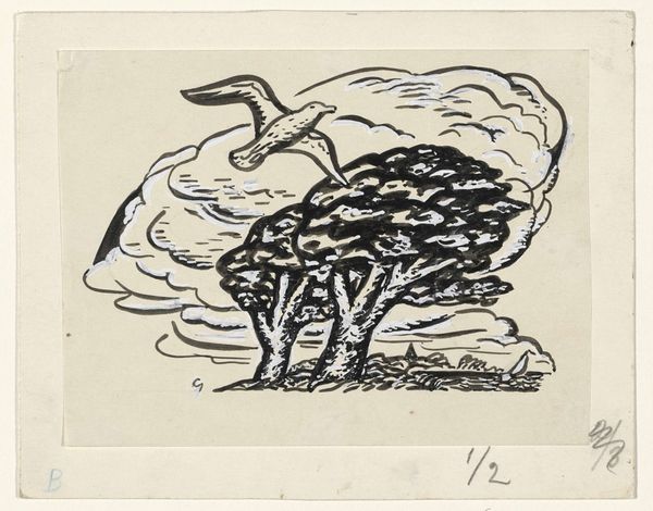 Curator: The crisp, contrasting lines of this drawing grab me immediately. There's a powerful graphic quality, despite the subject's inherent gentleness. Editor: We’re looking at "Duif," or "Dove," a blue ink drawing created by Leo Gestel sometime between 1891 and 1941. It's currently held at the Rijksmuseum. For me, the real intrigue lies in the execution; the clear Art Nouveau influence points to mass production possibilities. Was this a design intended for broader distribution? Curator: Absolutely, the linear style lends itself to reproduction techniques. The use of ink allows for a fluidity in design that is not often achieved by this level of clarity and makes me think about the social impact of Gestel’s design – a beautiful yet functional design affordable enough for many. I'd suggest that we consider it an effort to democratize access to symbolic art. Editor: Interesting. I’m drawn more to its symbolism within the art historical context. Doves, of course, are iconic, going way back; images representing purity and peace but it would be interesting to know what cultural or political meaning Gestel associated with this image during its historical period. This particular representation seems quite grounded. Not soaring, but very much present. Curator: Yes, note how the artist has framed the dove. With graphic cloud shapes in one corner, juxtaposed with stylized reeds in another corner. It is interesting how they all play to, what I consider, an interesting material use and creative outcome. The heavy lines around the body of the dove, in comparison with the open unburdened space for the feathers of the bird; as if Gestel sought to convey something in this specific creation. Editor: Agreed. Thinking about this being at the Rijksmuseum, I wonder about how its significance evolved over time, in this public, national collection. I suppose that institutions played an undeniable role in shaping how we understand the intention and affect of such works. Curator: I find it powerful to explore artwork like this, uncovering social factors in both the means of its production, and what materials have helped it last across time. Editor: Yes, this image's journey through various cultural interpretations and museum politics is so enriching, and of course essential to remember.