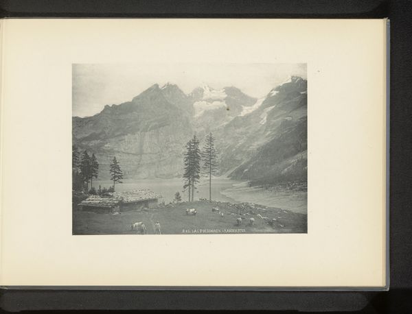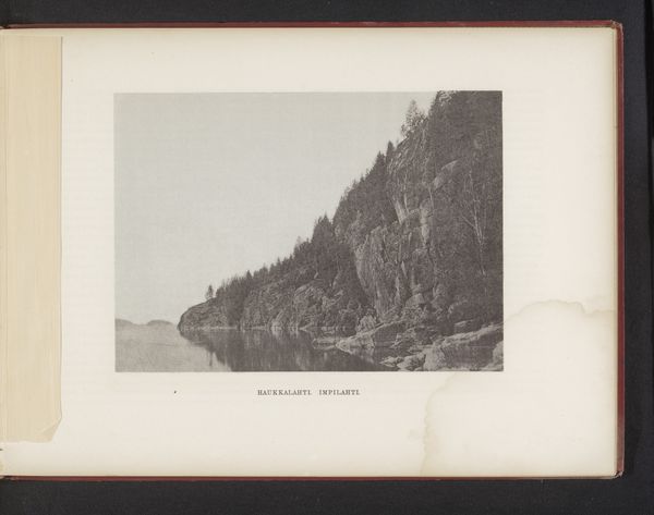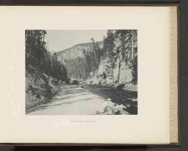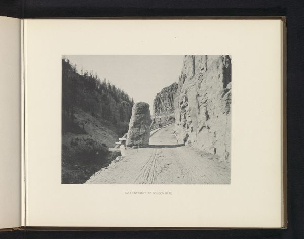 Editor: This is "Golden Gate Canyon," a gelatin-silver print taken by Frank Jay Haynes before 1891. The monochromatic tones and dramatic landscape create a stark, powerful feel. What formal qualities stand out to you? Curator: Immediately, the stark contrast arrests the gaze. Consider the formal dichotomy: a play between the textured, jagged face of the canyon wall on the left, juxtaposed against the more linear, vertically-oriented stand of trees on the right. Do you notice how the photographer has positioned the road? Editor: Yes! It creates a diagonal line leading the eye deeper into the canyon, emphasizing the vastness of the space. Is that a common compositional strategy? Curator: Indeed. It exploits linear perspective, a strategy rooted in the Renaissance and continually reimagined. Here, though, the silver gelatin print gives the image a certain weight, a physicality. The manipulation of light and shadow further enhances the structure, defining the spatial relationships. How does the composition inform your perception of scale? Editor: It emphasizes it. The road looks tiny against the immense rock formations. The image almost seems to celebrate the power of nature, yet there's also something serene in the ordered way the photographer framed it. Curator: A tension emerges from the sharp definition of light and dark—what some may call a "sublime" quality. Haynes harnesses tonal gradation and strong lines. Together, the compositional elements communicate a profound sense of place. Editor: I see it now. Looking closer, I realize how much the balance of dark and light, texture, and perspective truly shape the image. I hadn't considered those dynamics. Curator: Paying attention to how visual elements such as line, shape and form interact can unlock a world of understanding.