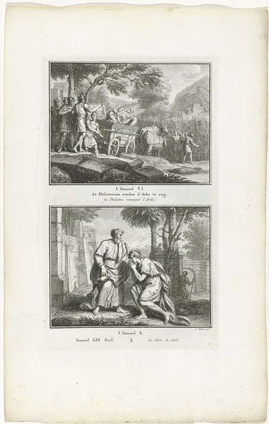 Curator: Welcome! Today, we are observing a 1791 engraving by Jacob Folkema entitled "Offer van Manoach en Simson doodt de leeuw," held here at the Rijksmuseum. It depicts two scenes from the biblical story of Samson. Editor: The stark contrasts immediately create a dramatic tension, don’t they? The scenes are bisected, one ethereal and the other quite…visceral. There's a power dynamic visually encoded here that strikes me as incredibly compelling. Curator: Precisely! In the upper register, we see Manoah and his wife witnessing an angel ascending to heaven after their offering, a theophany representing divine intervention. This symbolises hope and divine favor within the narrative. Note the compositional use of clouds and upward motion. Editor: And below, Samson confronts the lion, embodying the raw strength divinely bestowed upon him. The lion is less bestial and more like another "Other" to overcome, given Samson's narrative positioning in colonial discourse and questions of power. Curator: Samson himself is a layered figure. He embodies both divine favor and human frailty. Consider how Folkema uses line and shading. What do you interpret about the relationship of the line weight between angel and lion, divine versus beastial? Editor: The contrast underscores the patriarchal structures embedded in the story—Samson as the hyper-masculine deliverer ordained by a divine, yet very male, power. It also points to the social mandate implicit within such figures as chosen. And then his acts of violence enacted on "others"— lions or Philistines. Curator: You've contextualized Folkema's work compellingly, reminding us of its lasting, if sometimes troubled, echoes in art and thought. I notice here the compositional similarity between the angle rising to the clouds with his arms extended, mirrored below with Samson’s arms raised facing the lion. Editor: Absolutely. Looking closely, these lines can make us consider the different social structures at play, reflecting upon its place in wider societal narratives about power, agency, and faith. I’m also noticing how Folkema portrays a very human and emotional reaction in Manoah and his wife. Curator: Indeed, capturing both their awe and humility before the divine—or considering your points, editor, how carefully constructed is it and how do its underlying patriarchal values surface to this very day? A compelling question that, of course, shifts in different cultural contexts, yet maintains this very rigid line about right versus wrong, as decided by men in power. Editor: Ultimately, what strikes me most is how effectively this engraving distills those layered meanings.