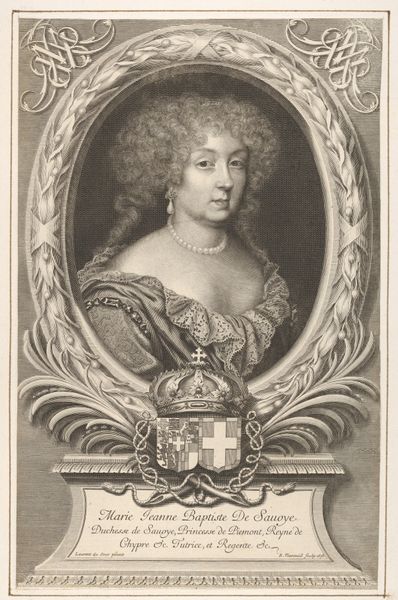 Curator: Looking at this image, I immediately feel the weight of 17th-century French aristocracy. Editor: Indeed. Here we have a print from 1666, attributed to Pieter van Schuppen after G. J. Tassaert. It's titled, "Portrait of Anne Marie Louise d'Orléans, Duchess of Montpensier.” Curator: Her gaze is very direct, almost challenging. The baroque flourishes give it an air of theatricality, but there's a coolness in her eyes, a sense of calculated power. Editor: Let's unpack that. This image exists within a broader framework of royal portraiture where representations were tools for establishing status, dynastic continuity, and shaping public image. Consider how the print medium itself allows for widespread dissemination. Curator: Exactly. It is the way visual statements cement power. And a critical lens tells me her clothing and ornamentation become signifiers of wealth and privilege during a period of immense social stratification. What does it mean to have access and control over visual culture? Editor: Furthermore, Van Schuppen was a key figure in Parisian printmaking circles. The stylistic choices--the delicate lines of the engraving, the composition that highlights the opulence, it all served a function for communicating her political positioning in the court of the Sun King. Curator: It goes beyond simple representation, right? I mean, look at the ornate frame surrounding the portrait – it’s another layer that emphasizes her separation and elevation from society’s less fortunate. I'm considering who and what she protects. Editor: So it's less about accurate representation and more about constructing a particular kind of aristocratic ideal and leveraging the Baroque artistic tendencies into a communication of soft power. Curator: Right, considering who this image might have served – the elites who benefited from the status quo and what role gender and sexuality may have had in these visual choices of who to empower and elevate. Editor: That makes me look at this print in a new light. There’s so much more happening here than a simple portrait. Curator: It always comes down to what these portraits communicated, how they worked in their context and who could be influenced. Thanks for joining me.