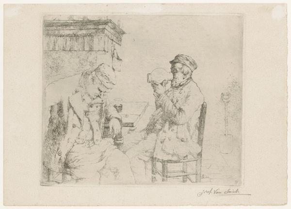 Editor: Here we have "Outside an Osteria," a pencil drawing by Wilhelm Marstrand, sometime between 1810 and 1873. It's wonderfully detailed. I'm struck by the relaxed atmosphere—the way the figures are clustered together creates such an intimate, communal vibe. What draws your eye when you look at this piece? Curator: The everydayness of it all! That’s the charm, isn't it? The casual groupings under the arbour, the donkey patiently waiting... it whispers stories of life lived in unhurried rhythms. What I love about Marstrand is his eye for the beautifully ordinary. It feels romantic, like stepping into a favourite novel, wouldn't you agree? Look at the light filtering through the leaves—what does that evoke for you? Editor: It feels inviting, like being transported to a lazy afternoon in a Tuscan village. The light adds a sense of warmth and serenity. And the details, like the woman with her spindle, make it feel so authentic. It really captures a sense of place and time, doesn't it? Do you think he's idealizing the scene at all, or presenting it realistically? Curator: Ah, now that's the eternal question with genre painting, isn't it? There's likely a gentle rosy filter applied, wouldn't you think? But even through that lens, he’s offering us a slice of life. Maybe a bit sweetened, like the wine I imagine they're drinking under those leaves. Do you find yourself wanting to know their stories? Editor: Absolutely! Each figure feels like a character waiting to be discovered. And the setting just pulls you in. It makes me appreciate how much narrative potential there is in everyday moments. Thanks—this has given me a lot to think about! Curator: And me! Art like this reminds me that beauty exists in the pause, in the shared company and sunlight of everyday moments. Perhaps Marstrand's greatest achievement lies not just in depicting, but in inviting us to savor the poetry of the mundane, wouldn't you say?