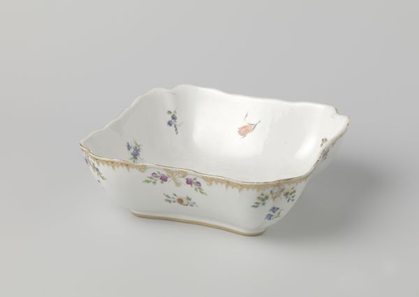 This is a porcelain dish adorned with bouquets and flower sprays made by Fabriek Dominique Denuelle. The composition achieves a delicate balance between the structured form of the dish and the seemingly random, organic distribution of floral motifs. The flowers, rendered in soft pinks, purples, and greens, are scattered across the pristine white surface, creating a visual rhythm that is both pleasing and subtly complex. The dish's form, with its gently curving sides and gilded edges, introduces a play of light and shadow. This accentuates its shape and creates a sense of contained space. The floral patterns are not merely decorative, but engage with notions of luxury and refinement. The gilded trim enhances this further. This dish exemplifies how decorative arts can embody larger aesthetic and cultural values through form and design. It invites us to consider how everyday objects can reflect deeper societal tastes and values.
