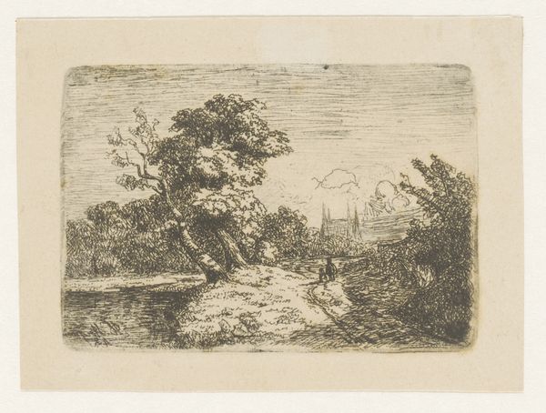 Editor: So, this is Charles Jacque's "River Landscape with Trees and a Sandy Path Along the Bank," an etching from 1844. I’m really drawn to the intricate detail and how the artist captured this serene, almost melancholic, atmosphere. What are your thoughts when you look at it? Curator: It’s fascinating how seemingly simple images can carry such weight, isn’t it? Landscapes like this often tap into our collective memory of nature, a shared cultural understanding of peace, but also perhaps a subtle commentary on humanity’s place within it. Notice the lone figure in the distance. What does that evoke for you? Editor: It does create a sense of loneliness, or perhaps contemplation. The etching seems to position nature as both a refuge and something indifferent to the human experience. The symbol of someone traveling… maybe this is just life. Curator: Exactly. And the trees themselves, look at the skeletal branches, almost reaching like supplicating figures. Trees in art are ancient symbols—the tree of life, of knowledge, of interconnectedness. This recalls an Arcadian ideal but is tempered by realism; life, death, and rebirth. Do you think Jacque was consciously using those symbols, or do you think he might have been unconsciously drawing from this common visual language? Editor: It's hard to know for sure, but given the time period, I'd wager he was likely very aware of the tradition. It's so thought-provoking how art can embed these deep-seated ideas! Curator: Precisely. And these images remain relevant. The power of symbolic language connects us across time and shapes our perception of the world. Editor: It makes you see so much more in what seems like a simple image at first glance! Curator: It truly does. It highlights the cultural memories embedded within these kinds of artworks.