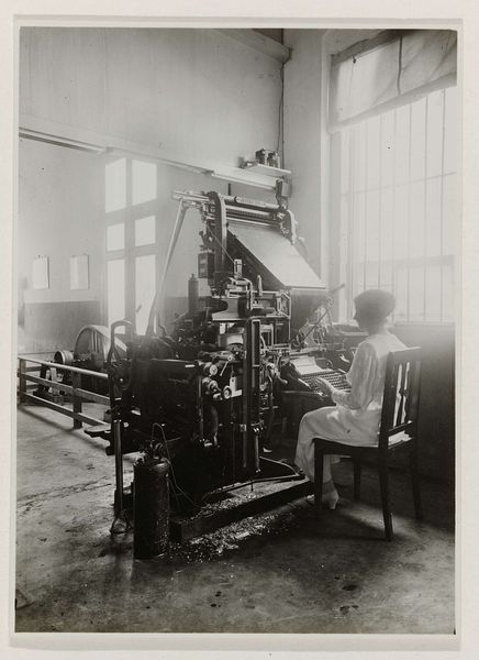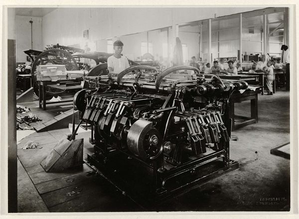 Editor: This is "Machines in de drukkerij," a 1921 print photograph by T. Kaneo. It feels very mechanical and precise; the composition draws my eye around the room, following the lines of the machinery. How do you interpret this work? Curator: Focusing on the interplay of lines and forms, consider how the artist has constructed a dynamic visual experience from an essentially static industrial scene. Note the contrasts, particularly of light and dark, to generate spatial depth, rhythm, and movement in the photographic print. What compositional elements guide your perception? Editor: The strong diagonal lines, mostly, which almost seem to be slices through the photograph and cut across other mechanical elements that seem repetitive. I didn’t know photography could create a sense of chaos like that! Curator: Precisely. It achieves an intriguing dissonance between realism and formal experimentation. Semiotically, we might analyze the repetitive nature of the machinery as a symbol itself – perhaps an indicator of modernization’s advance, but achieved through the abstraction of those repeating parts. How does that resonance, or lack of it, play with your expectations? Editor: It's interesting. I hadn't considered how those repeating parts could act as their own statement about industrialization. Are you saying the success of this picture is due to more than just it's capturing a particular historical moment? Curator: Precisely. Consider the photographer's construction through compositional form; even outside the historical context, we still have a strong artistic product through Kaneo's management of contrast and spatial planes. The subject becomes secondary to the pictorial design, and speaks to larger questions of how representation occurs through purely formal choices. Editor: Thanks; it’s interesting to consider how such choices enhance the picture's overall impression and transcend genre, or medium even. Curator: Indeed, and this has opened some fruitful territory regarding the value of formal abstraction!