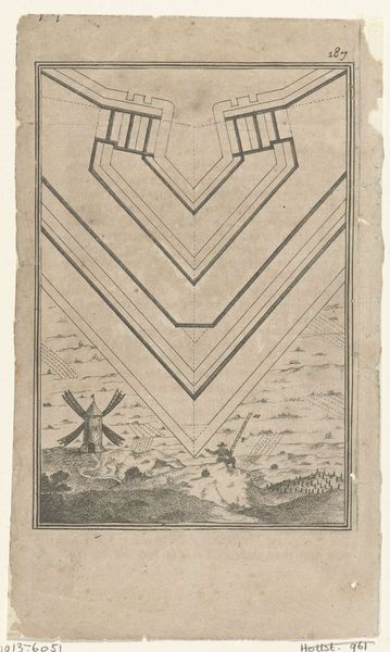 Editor: This is an engraving from 1672 by Romeyn de Hooghe, titled "Illustration for 'The Labour of Mars' by Allain Manesson Mallet," currently at the Rijksmuseum. I’m struck by the contrast between the regimented geometry of the fort’s design and the chaotic scene of soldiers below. What can you tell me about this piece? Curator: That's a sharp observation! The contrast is certainly intentional. What interests me most is how this image reflects the power dynamics of the 17th century. It visualizes a period defined by military expansion and the entrenchment of patriarchal structures. Editor: In what way? Curator: The fort design, meticulously mapped out, represents control, order, and the scientific rationalization of warfare. It speaks to the colonial impulse and the subjugation of land and people. How might we interpret the scene below in relation to that impulse? Editor: It seems like the drawing of the fort almost floats above the actual scene of the fighting; it’s like the fort is an idea imposed on reality, rather than growing out of it. Curator: Exactly! This relates to a worldview where land is something to be conquered and redesigned according to abstract principles, ignoring existing cultures and power structures. It embodies a masculine ideal of dominance and the reduction of complex realities into simplified, manageable forms. Does it prompt you to question any contemporary structures of power? Editor: Definitely! I'm thinking about city planning today, and how some urban designs prioritize efficiency over community well-being. I didn't initially think of this engraving in such a contemporary way, but its underlying message is relevant. Curator: Precisely! Understanding art from the past allows us to critically examine the present, uncovering how historical power structures continue to manifest in new ways.