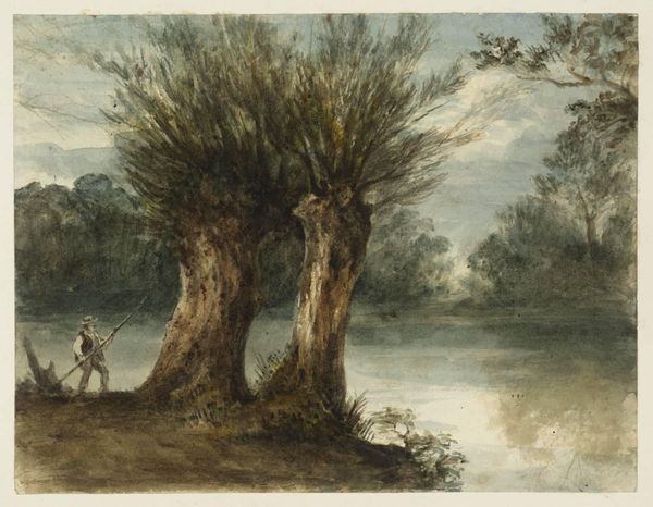 Editor: This small watercolor painting by the British School, of an unknown title and date, shows a landscape with a figure. I'm struck by its quiet, almost melancholic mood. What do you see here? Curator: I see a reflection of the changing role of landscape in British art and society. How did the rise of industrialization influence perceptions of nature? Editor: It's like a romanticized view in response to urbanization? Curator: Precisely. The figure seems almost secondary, dwarfed by the landscape. How does this imagery contribute to ideas of national identity and the picturesque? Editor: That’s a good point. I hadn't considered that. Thanks! Curator: My pleasure. It is always important to understand the public role of art.