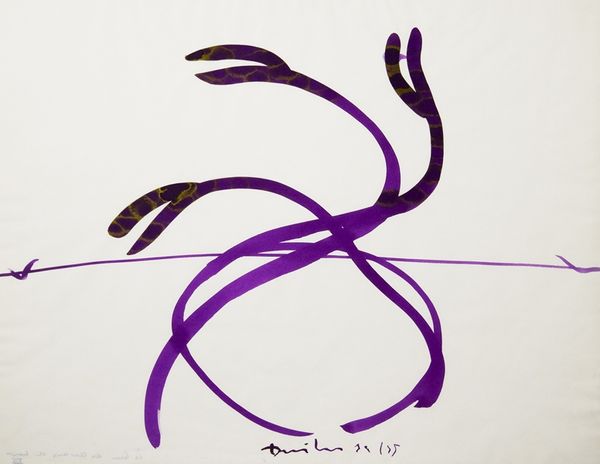 René Duvillier made Serpent de mer from probably ink or watercolour, sometime in the mid twentieth century. Look at the way the purple paint soaks into the white ground. It is thin, translucent, and moves like water. Here the artist has pulled a line across the page, with these bulbous forms balancing above and below it. You can see how the colour pools in some areas, while in others it's barely there, like a whisper. And look at those dark, almost black accents, like the serpent's eyes – or are they knots? There's a real sense of play and improvisation here. This reminds me of Henri Michaux's ink drawings. Both artists share a kind of gestural freedom, an embrace of the accidental. I love how Duvillier lets the ink do its thing, creating a fluid, dreamlike image that invites you to get lost in its curves and shadows. Artmaking is a process, and this piece captures a moment of spontaneous creation.