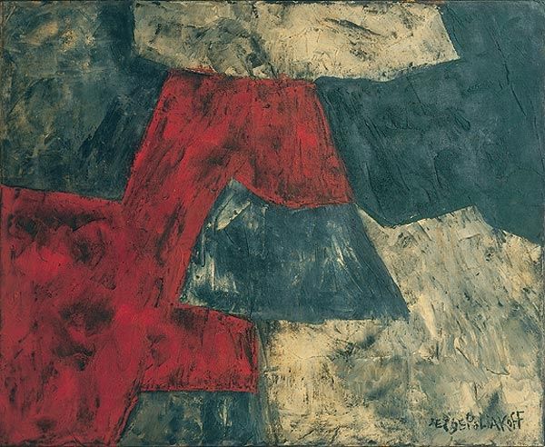 Curator: Looking at this piece, I immediately see an unresolved tension between dynamism and stasis. There's this large, looping form counterbalanced by sharp angles—it makes me a little uneasy. Editor: That’s an interesting reaction. What you’re seeing is Al Held’s "Untitled," painted in 1959 using acrylic on canvas. It’s a striking example of Abstract Expressionism. Curator: Abstract Expressionism, yes, but it feels… contained. Where’s the angst, the wildness often associated with that movement? Editor: Well, Held’s early work certainly engages with those gestural aesthetics, but he’s also clearly interested in the interplay of geometric forms. You can see his developing interest in a more structured approach, almost a dialogue between pure shape and the expressive possibilities of paint. How the use of form can create new ways of representation in art, as was a prevalent theme during this period. Curator: The red triangle in the corner adds another layer of… almost aggression, doesn't it? Breaking away from the blues and whites? Editor: I agree; the color contrast intensifies the forms themselves. Consider the weight and mass he creates with such simple elements. He doesn’t blend colors; instead, relies on bold chromatic relationships—the stark white outlining that deep blue center, for instance. It's about more than just the subject; it's about the object itself. Curator: This painting does show the shift that occurred during Abstract Expressionism when the radical individual gave way to these depersonalized styles which had profound implications. These types of approaches shifted the whole scene around these paintings to emphasize new art paradigms. Editor: It’s a potent painting! Ultimately, it reveals the tensions present in a pivotal art movement that, while being bold and unafraid to defy representation, was also rooted in the times it was made. Curator: And, for me, a testament to the lasting impact of those artistic decisions that shaped the modern world of aesthetics, the painting offers a look into the complex dynamics within post-war art movements.