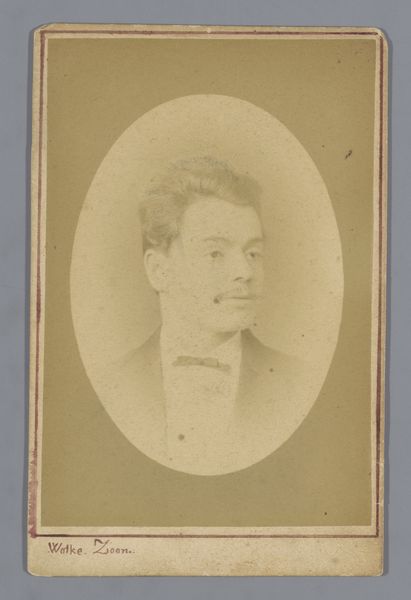 Willem Gerhardus Kuijer created this photographic portrait of an unknown man using the carte-de-visite technique. The composition centers on the oval frame that captures the subject’s likeness. Here, light and shadow are used to model the figure’s face and form, giving it a three-dimensional presence despite the photograph’s diminutive scale. The sepia tones imbue the image with a sense of nostalgia. This portrait raises questions about identity, representation, and the cultural codes embedded within the photographic medium. Who was this man, and what might his social standing have been? What stories do the formal elements of attire and pose tell us about the sitter’s self-perception and the photographer’s intention? Consider how the photograph's formal qualities invite us to reflect on the construction of identity and meaning. The sitter, now anonymous, gains a spectral presence through the enduring medium of photography.