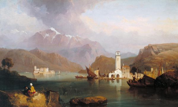 Editor: This is Charles Vacher's "Rezzonico and the Splügen Range, Lake Como," a watercolor that really captures a sense of calm. All those people on the shore... What do you see in this piece? Curator: Beyond the picturesque scene, I see a representation of leisure and privilege amidst broader social inequalities. Who had access to these idyllic locations in Vacher's time, and who was excluded? Editor: So, you're asking who gets to enjoy this "calm" and who doesn't? Curator: Exactly. Consider the colonial contexts often underpinning such scenes of European leisure. How does that knowledge shift our viewing experience? Editor: It makes me consider the unseen labor that makes this tranquility possible. Thanks for expanding my perspective. Curator: And thank you for prompting a crucial dialogue.