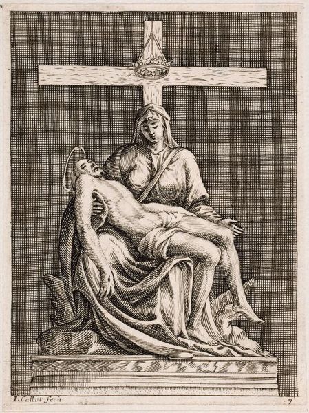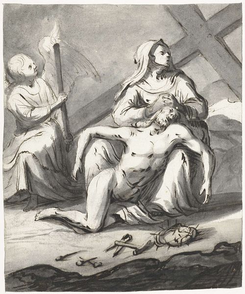 Curator: Jacobus Coelemans' engraving, "Dead Christ on the Lap of His Mother," presents a powerful Pietà scene. Editor: It strikes me immediately as intensely sorrowful; the gray scale adds a certain weight, and her expression conveys so much grief. Curator: Consider the sword behind Mary, piercing her heart, a potent symbol of her suffering, echoing the Latin inscription, "a sword has pierced her soul." It speaks to the complex dynamics of motherhood and sacrifice. Editor: Absolutely. The sword, beyond its religious context, represents enduring pain and the feminine experience of grief that resonates across cultures and time. Curator: The way Coelemans uses light and shadow creates an emotional depth, reflecting the themes of loss and redemption so central to this era. Editor: I agree. Ultimately, it's about love, loss, and the enduring strength found in shared pain, a theme ripe for contemporary discourse.